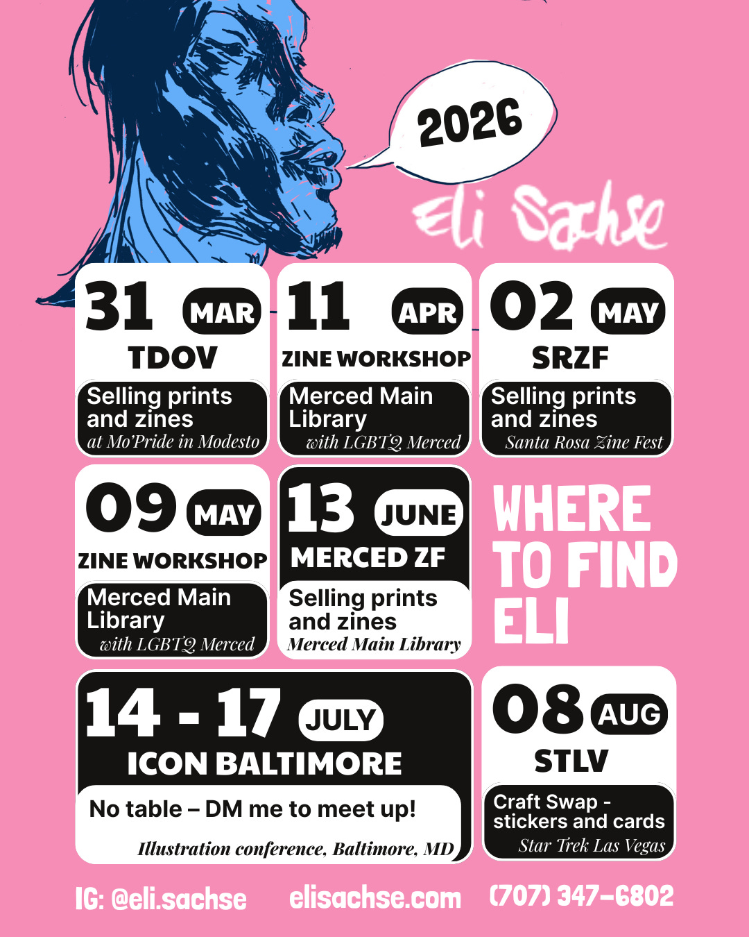 I’ll be selling zines and prints at Santa Rosa Zine fest in May and the Merced Zine Fest in June!